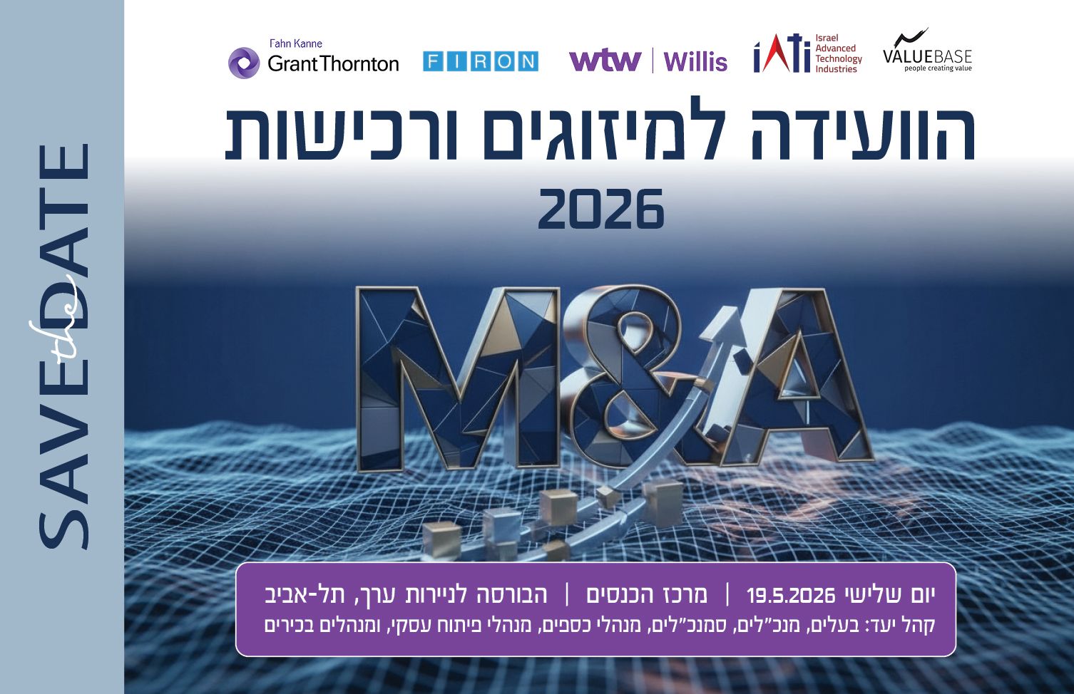 הועידה המובילה בנושא מיזוגים ורכישות תתקיים בתאריך 19.05.2026, בין השעות 09:00-14:00 בבורסה לניירות ערך, אחוזת בית 2, תל אביב בועידה יקחו חלק דוברים בכירים מהמשק הישראלי אשר ידברו על המגמות […]
